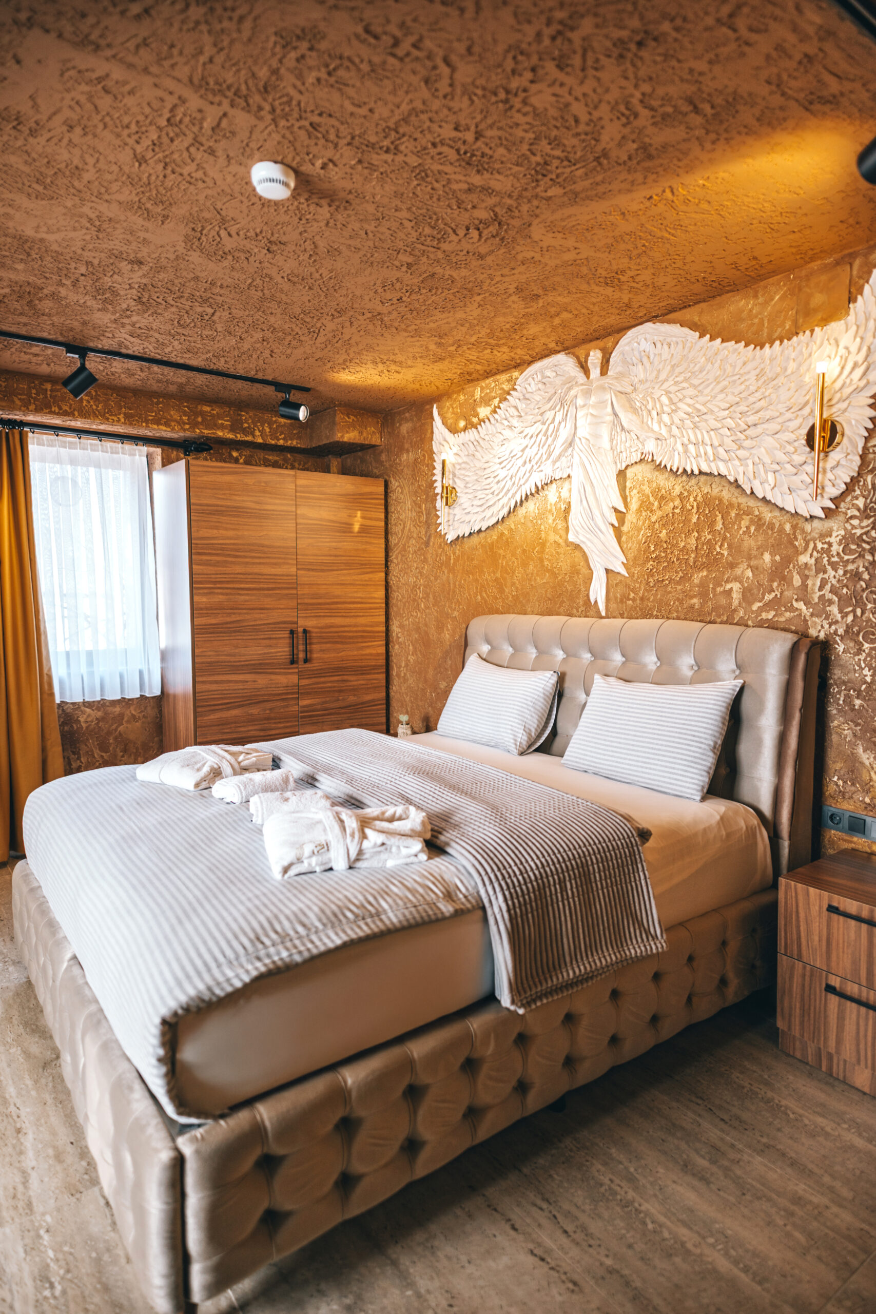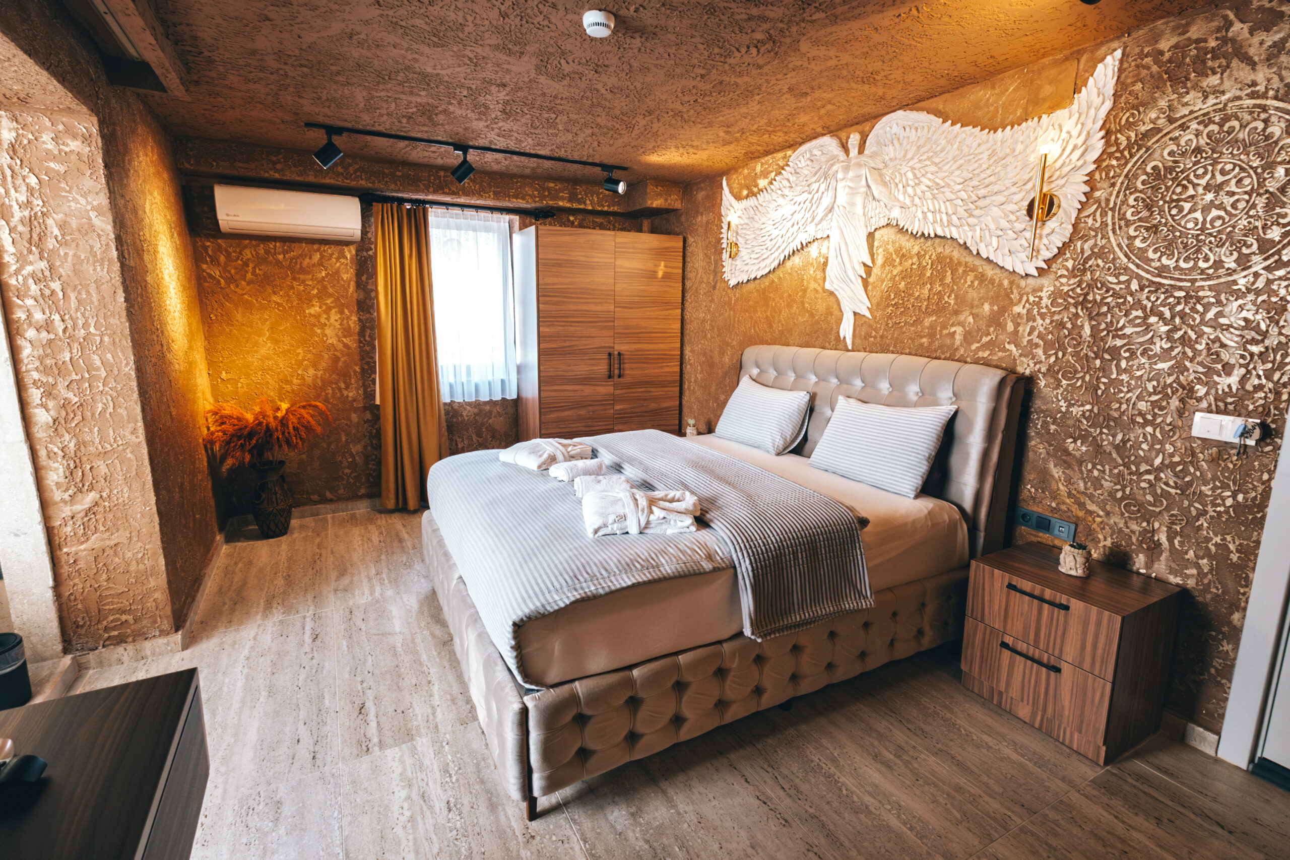 The room features unique sculptures and reliefs created by a renowned artist, adding an exclusive artistic touch. - Luxurious Materials and Finishes